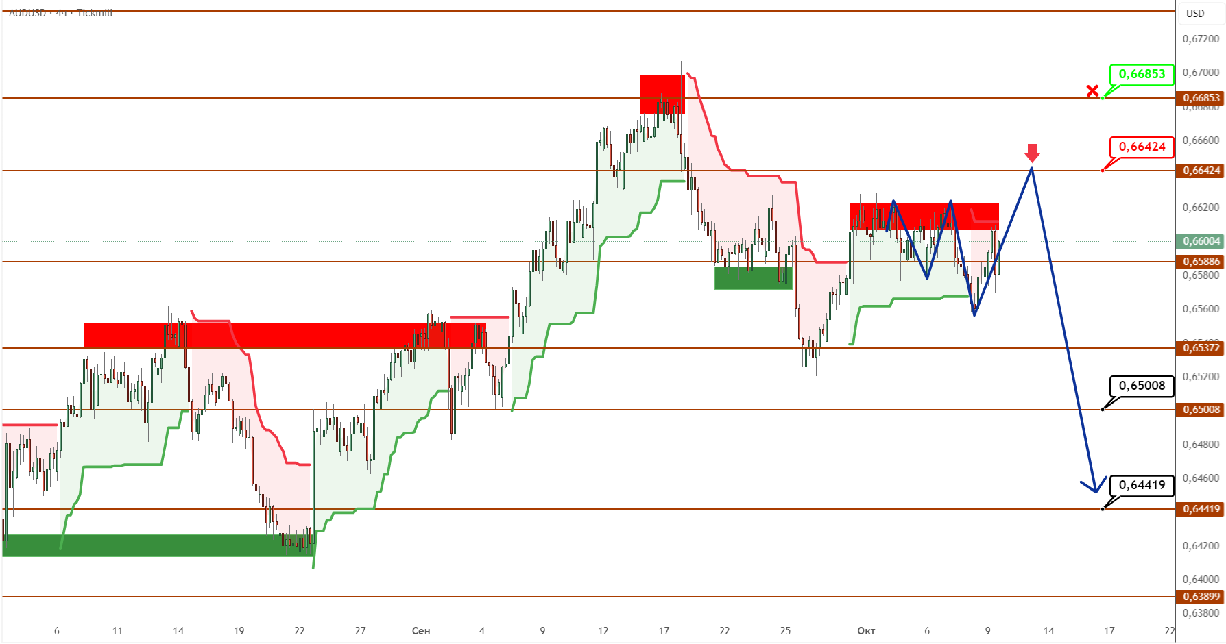 Сигнал на отмену текущего сценария будет получен в случае пробоя сопротивления и дальнейшего ухода цены выше разворотного уровня на 0,6685.