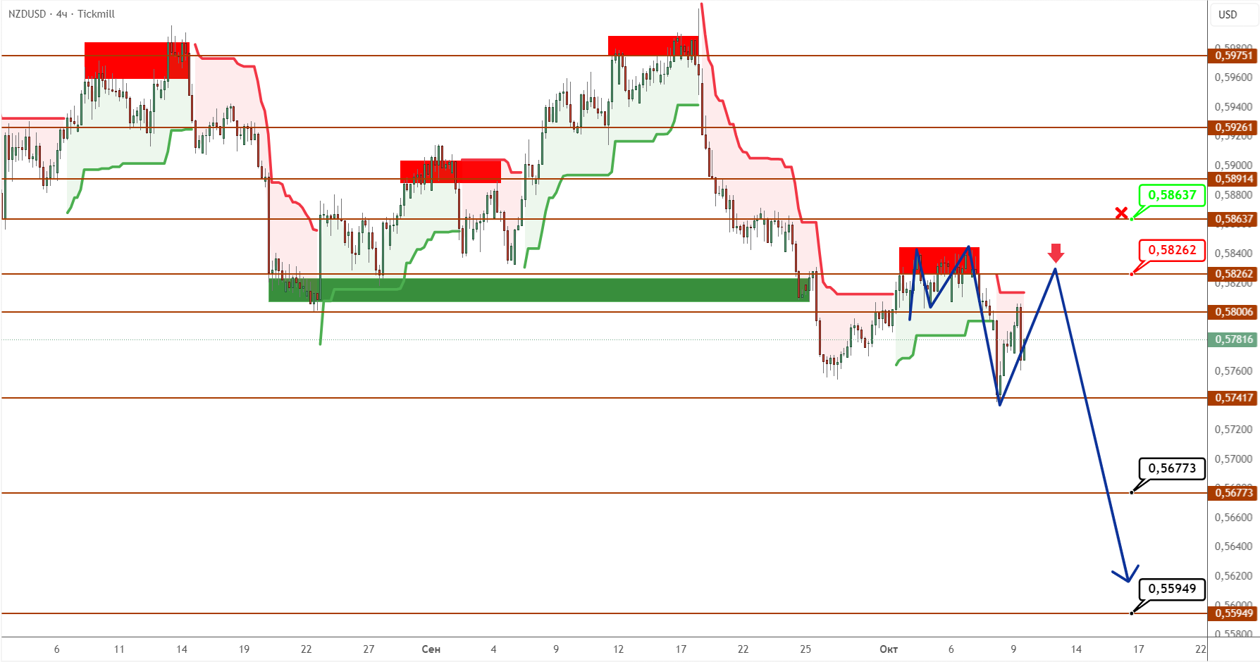 Сигнал на отмену текущего сценария будет получен в случае пробоя сопротивления и дальнейшего ухода цены выше разворотного уровня на 0,5863.
