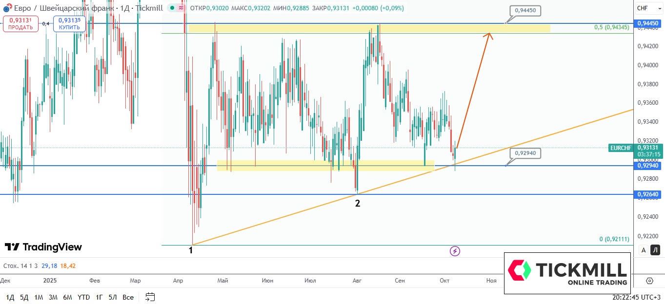 Валютная пара EUR/CHF оттолкнулась от точки пересечения уровня поддержки 0.9292, который по совместительству является нижней стороной широкого дневного диапазона, а также линии восходящего тренда, построенного по точкам 1 и 2. Отдельно стоит отметить тот факт, что сегодняшний день (среда) планирует закрыться бычьим поглощением, поэтому в ближайшие дни можем увидеть активность покупателей. Фокус рынка при реализации северного сценария – уровень 0.9445, который является противоположной стороной флета.